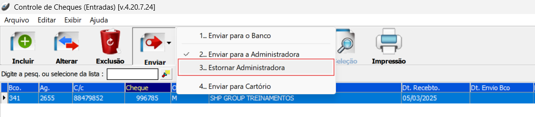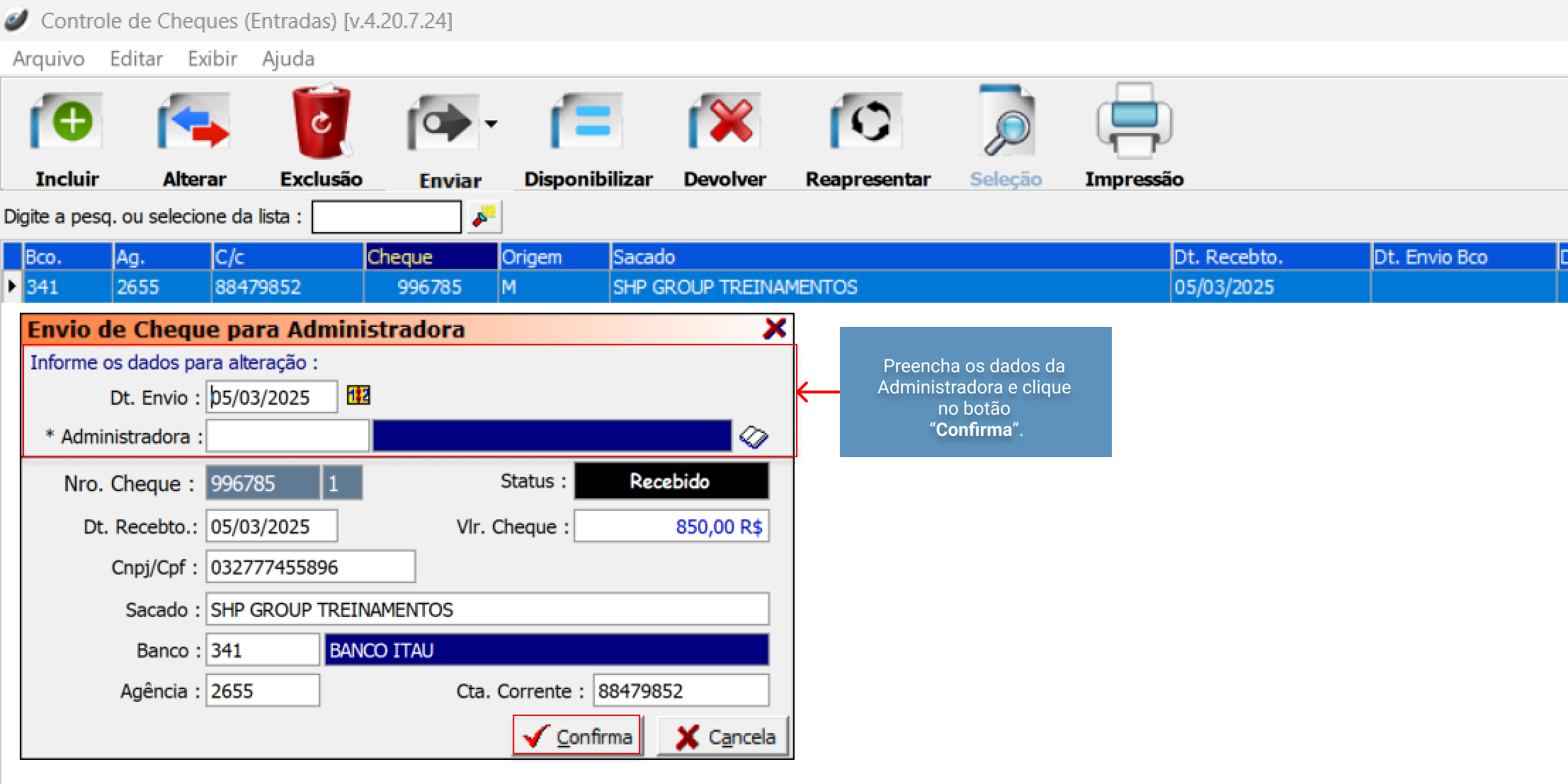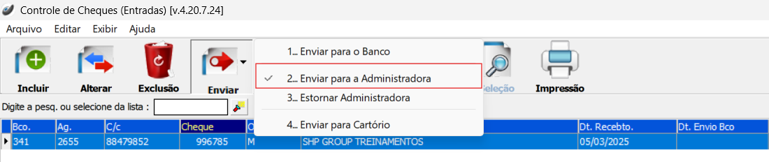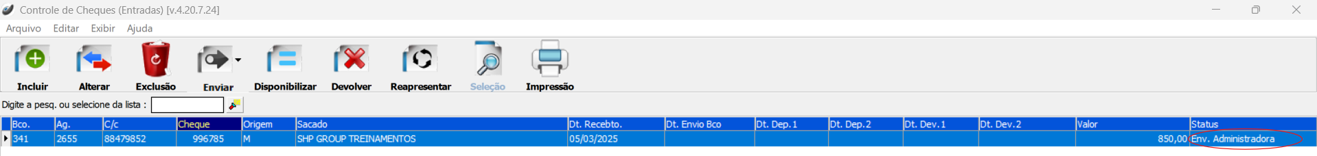 O cheque com o status: Env. Administradora é possível seguir com essa operação.