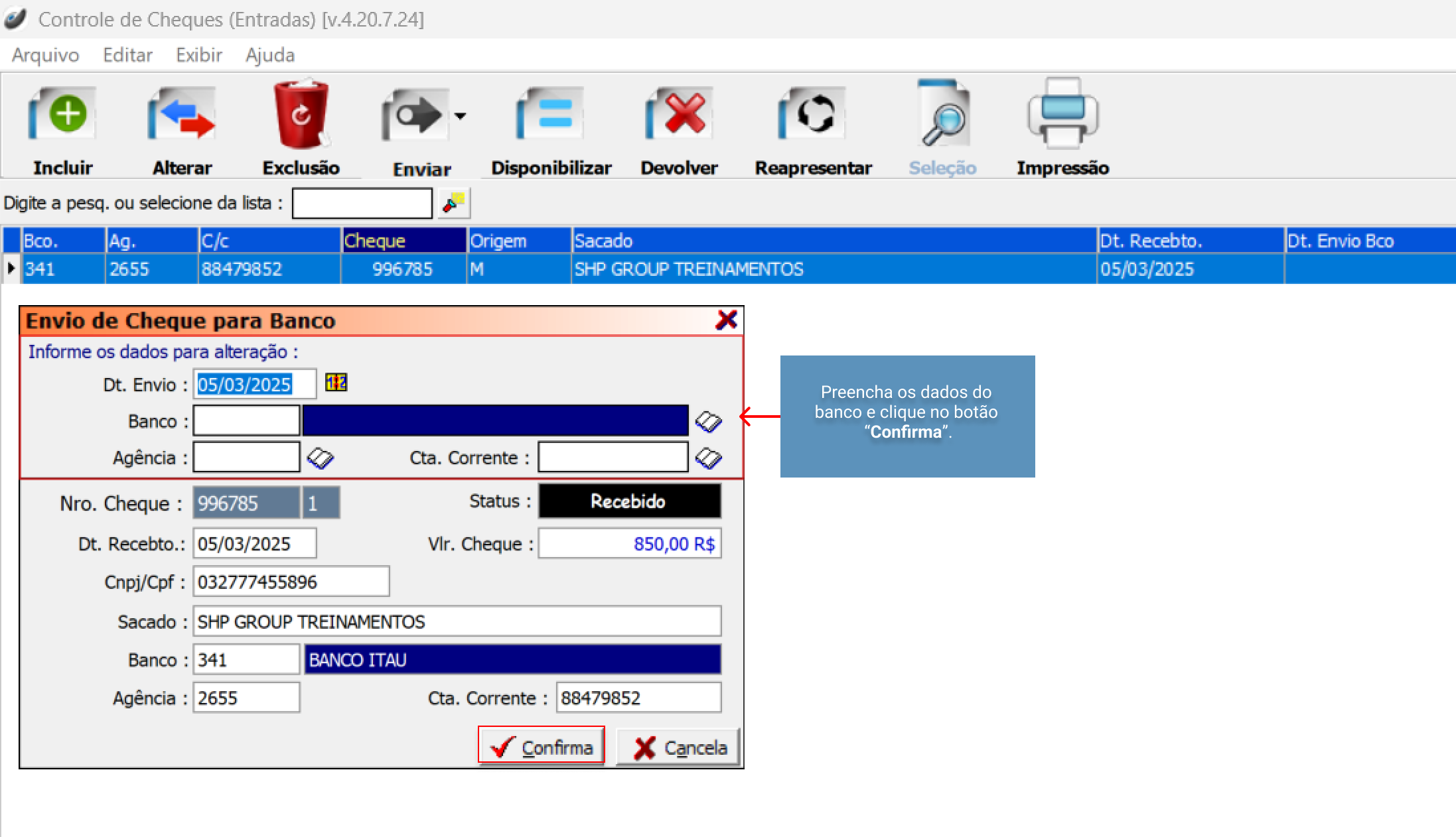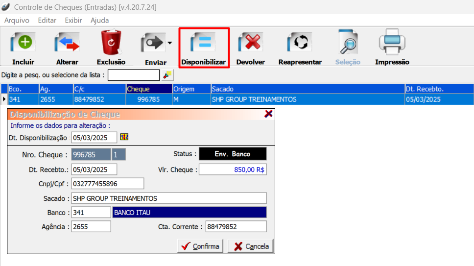 Para disponibilizar um cheque, clique no botão “Disponibilizar”, verifique os dados e depois clique no botão “Confirma”.