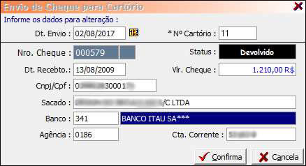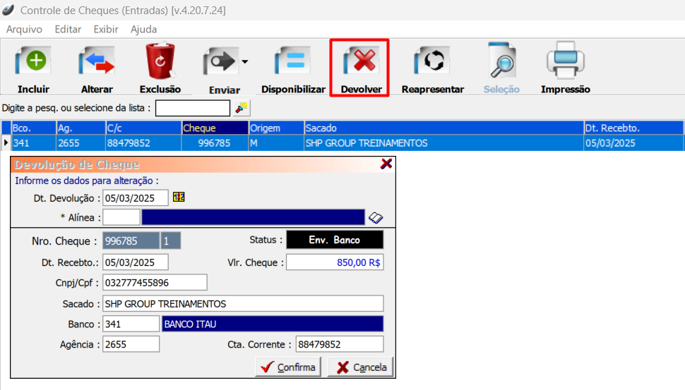 Para devolver um cheque, clique no botão “Devolver”. Preencha o campo obrigatório e clique no botão “Confirma”.