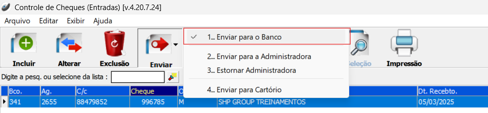 Para enviar os cheques incluídos no módulo Controle de Cheques, clique no botão “Enviar” para abrir as opções de envio conforme ilustrado abaixo: