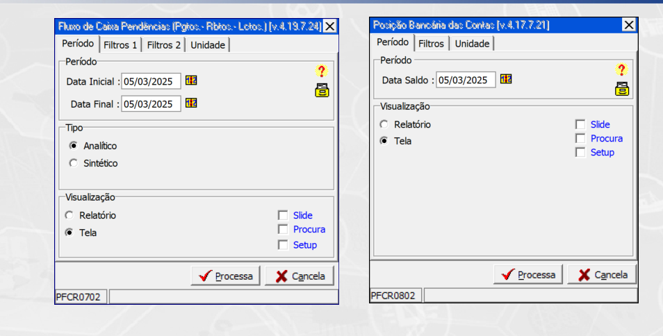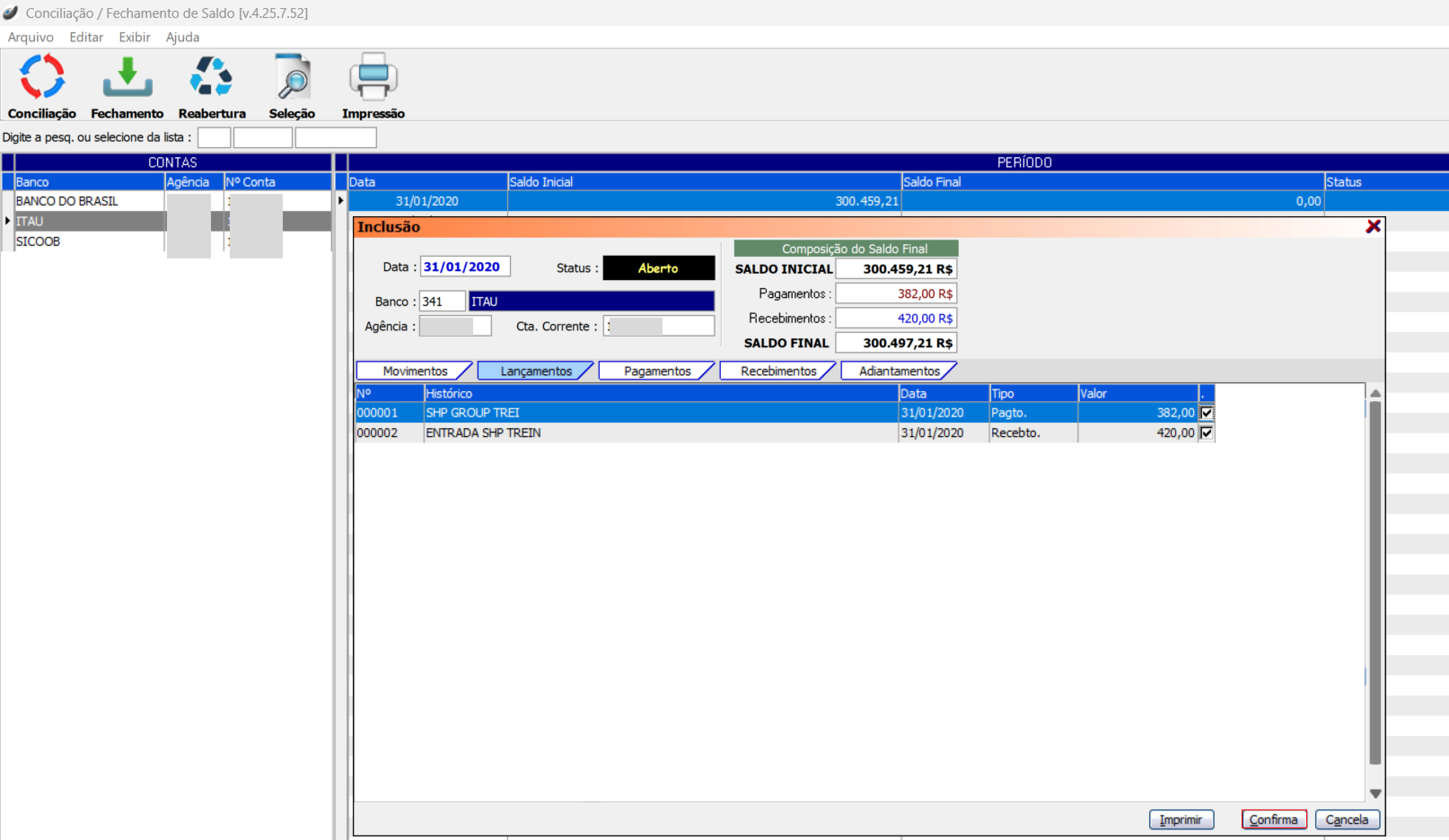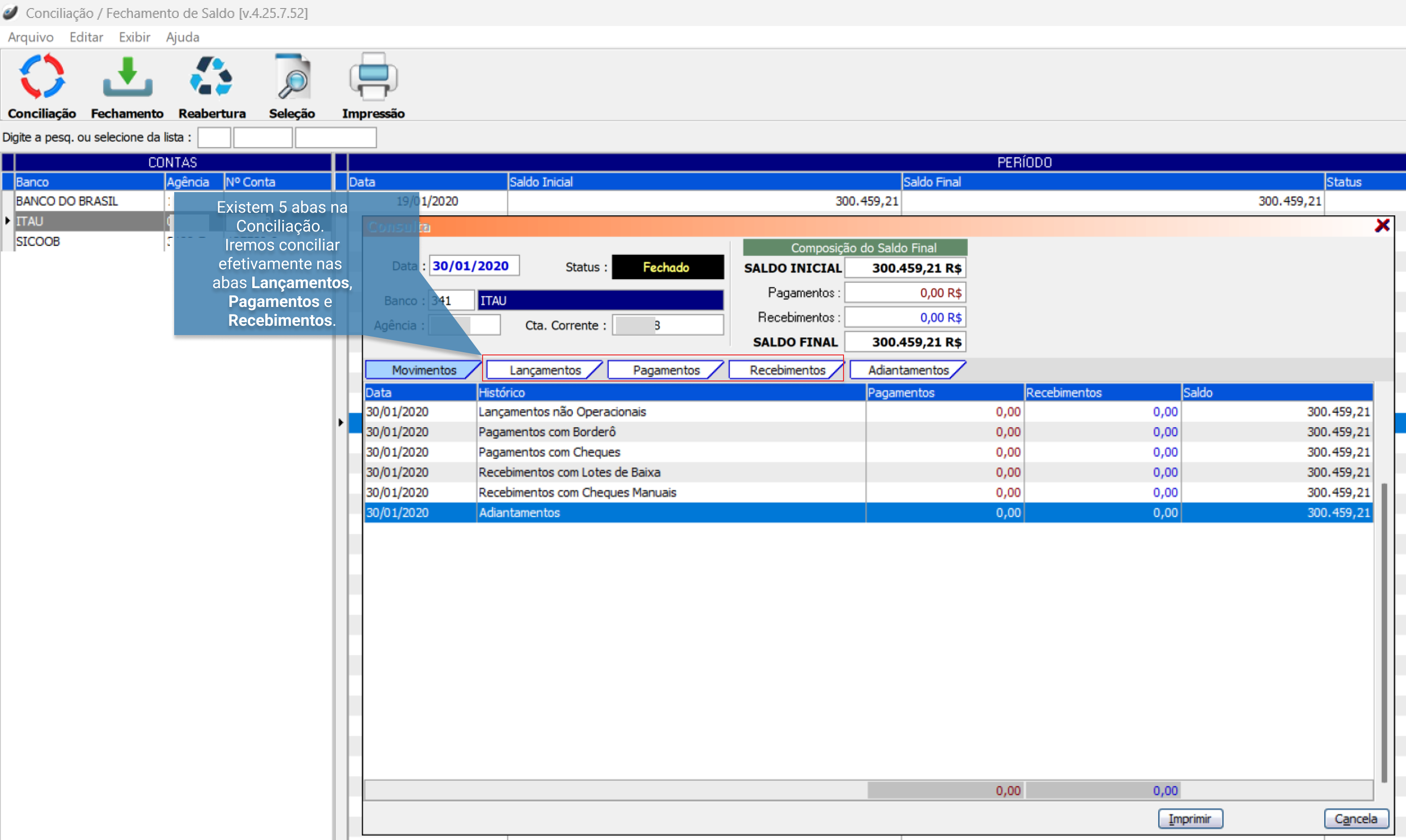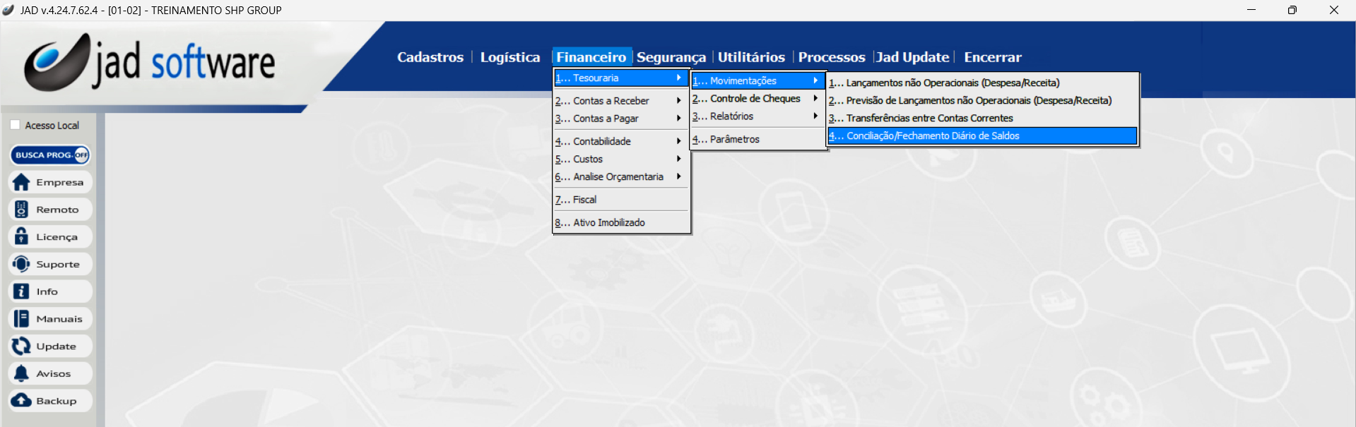 Financeiro > Tesouraria > Movimentações > Conciliação/Fechamento Diário de Saldos
