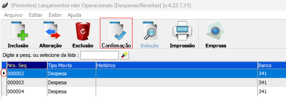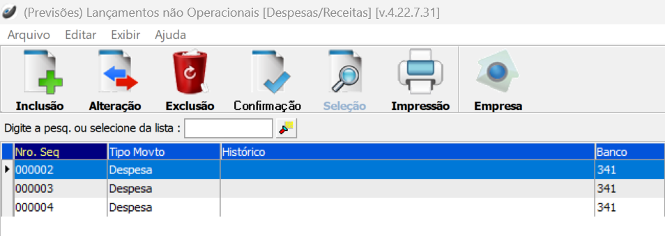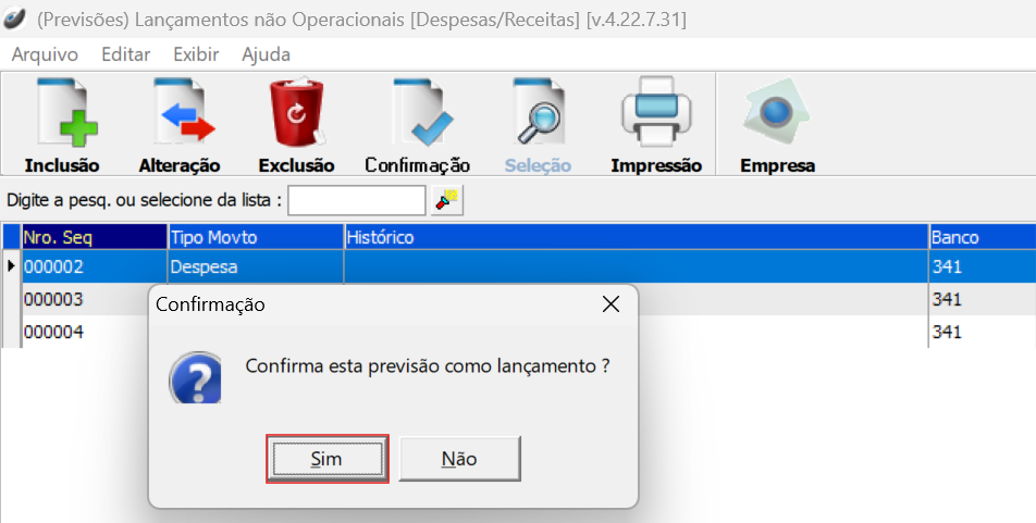 Ao confirmar esta previsão de lançamento não operacional ela sairá do gride, de previsão e constará no gride de “Lançamentos não Operacionais”.