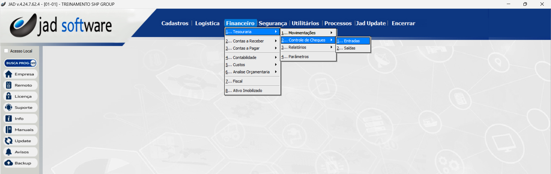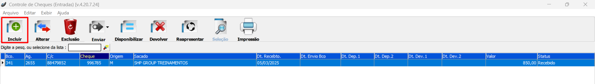 Financeiro > Tesouraria > Controle de Cheques > Entradas