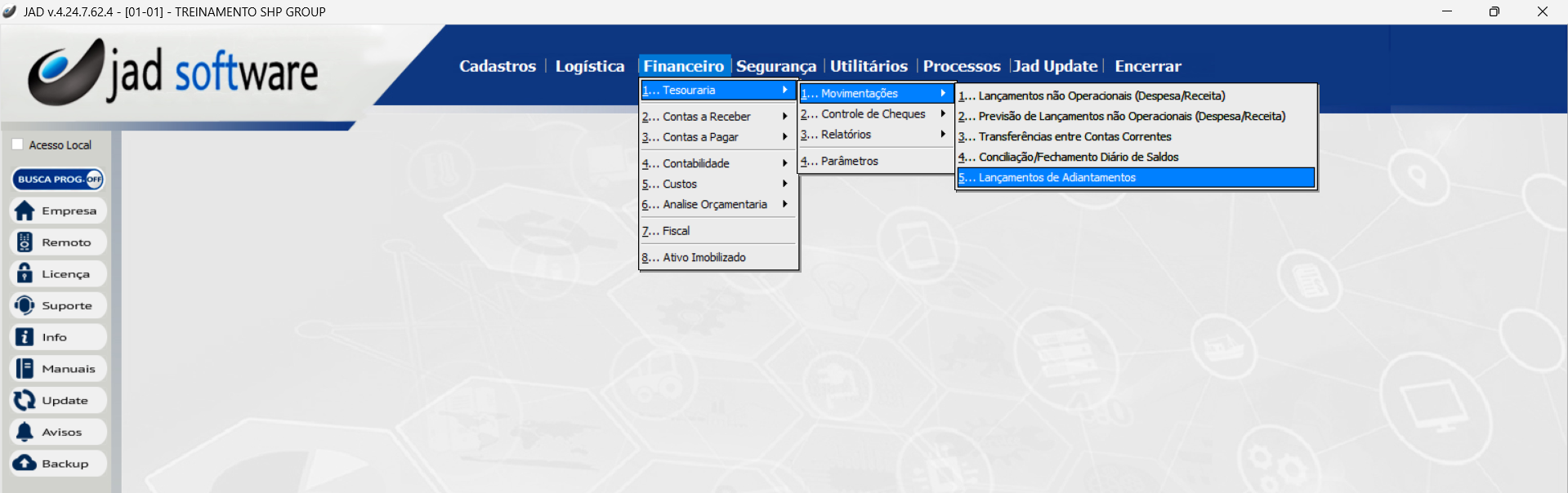 Financeiro > Movimentações > Lançamentos de Adiantamentos