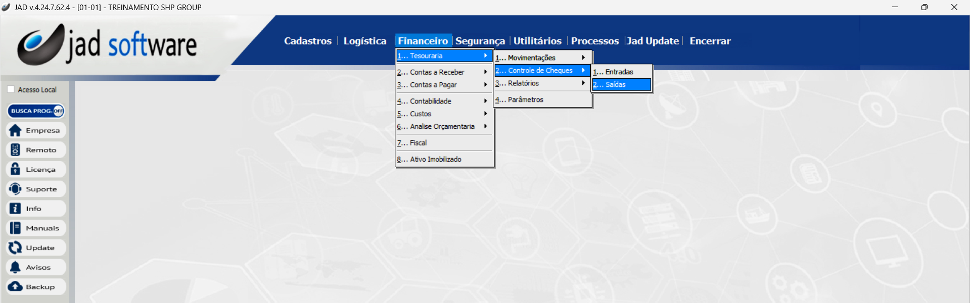Para acessar o módulo, deverá seguir a seguinte rota: Financeiro > Tesouraria > Controle de Cheques > Saídas