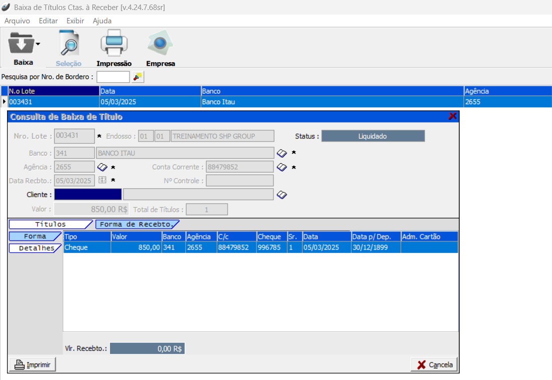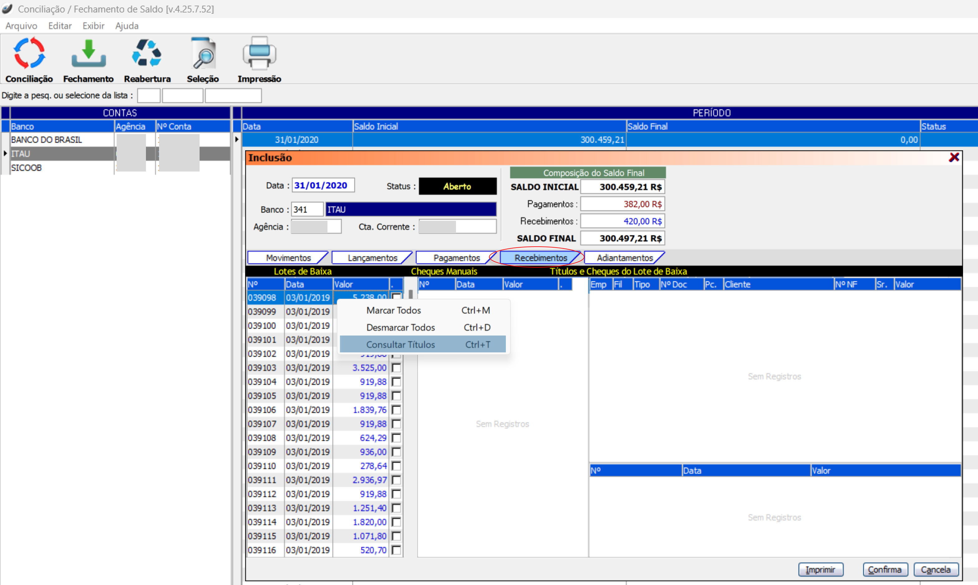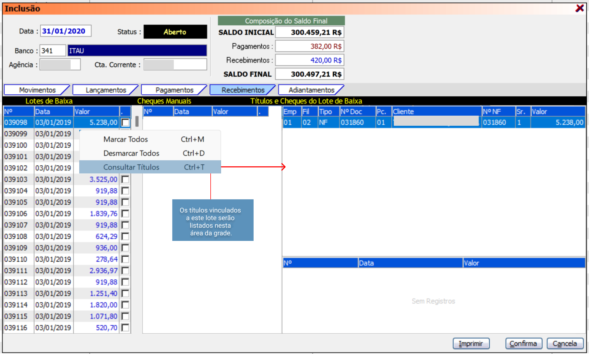 Aba “Recebimentos”, constará todos os lotes de baixa do Contas a Receber. Ao clicar com o botão direito do mouse sobre o Lote, podemos consultar os títulos vinculados a este lote.