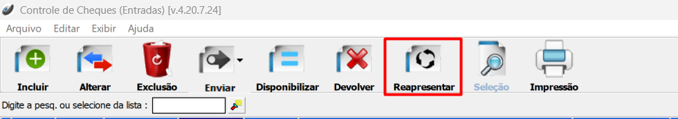 Para reapresentar um cheque, o “Status” dele deve estar “Devolvido”. Selecione o cheque e clique no botão “Reapresentar”.