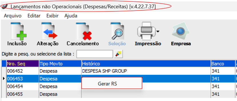 Ao clicar com o botão direito do mouse, em cima do lançamento, aparecerá a opção “Gerar RS”.