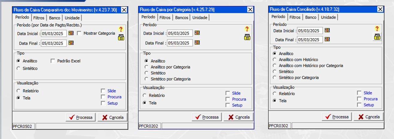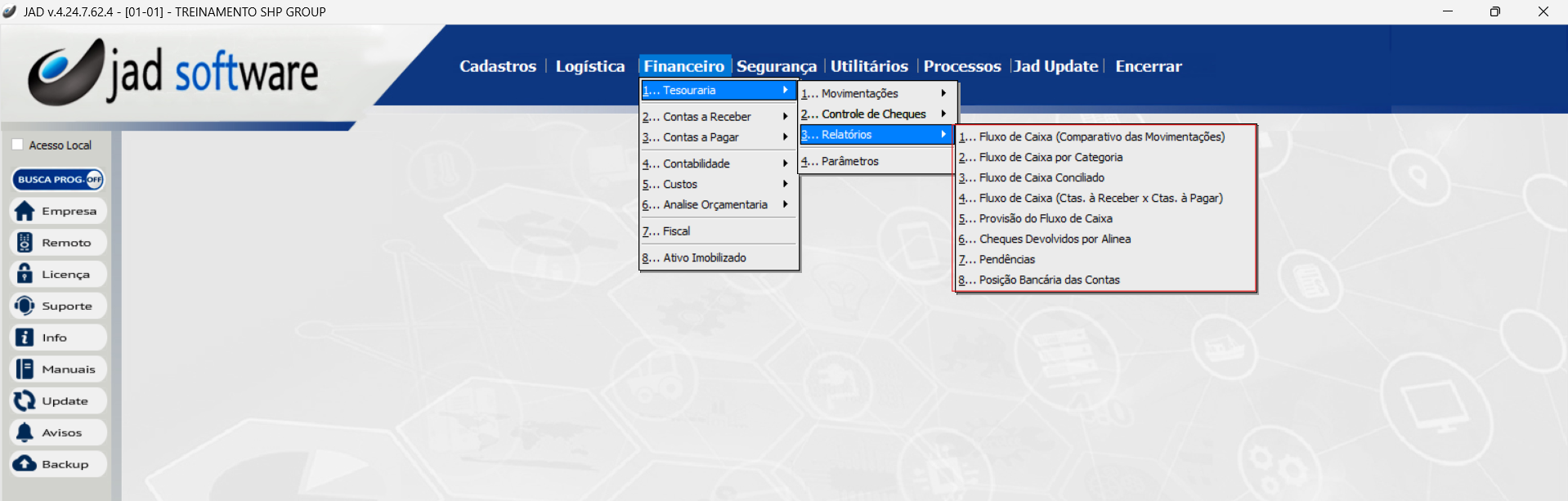 Existem oito (8) tipos de relatórios que podem ser parametrizados e emitidos dentro do módulo Financeiro >Tesouraria conforme ilustrado na imagem abaixo: