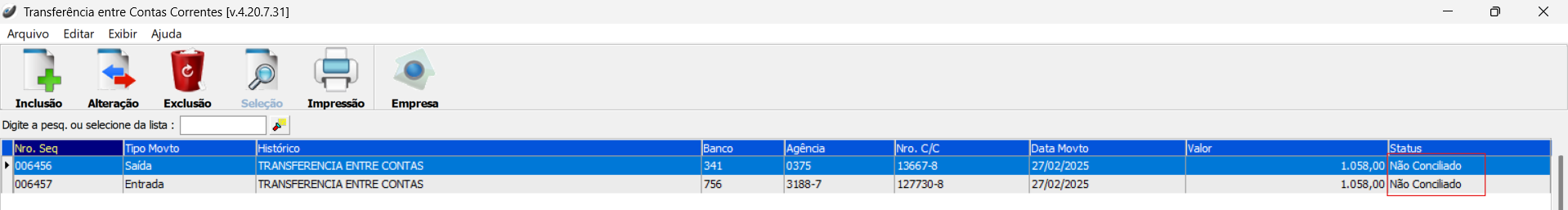 Após a confirmação, constará os lançamentos na grade do módulo de transferência entre contas, porém com o status “Não Conciliado”, e será preciso conciliar para que o saldo fique correto. Iremos mostrar nos próximos tópicos a conciliação bancária.