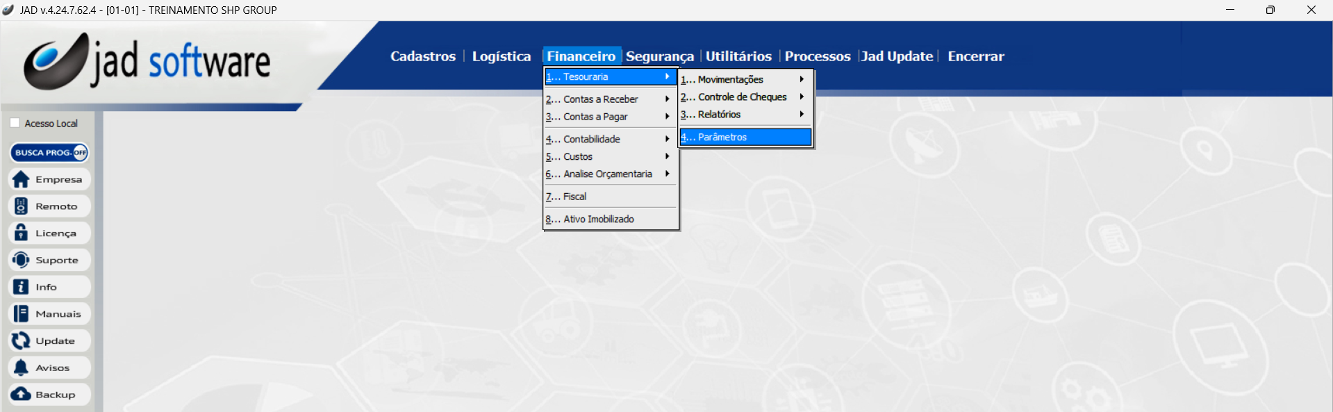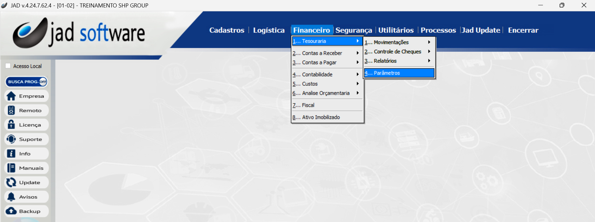 Para acessar ao modulo, siga a rota: Financeiro > Tesouraria > Parâmetros