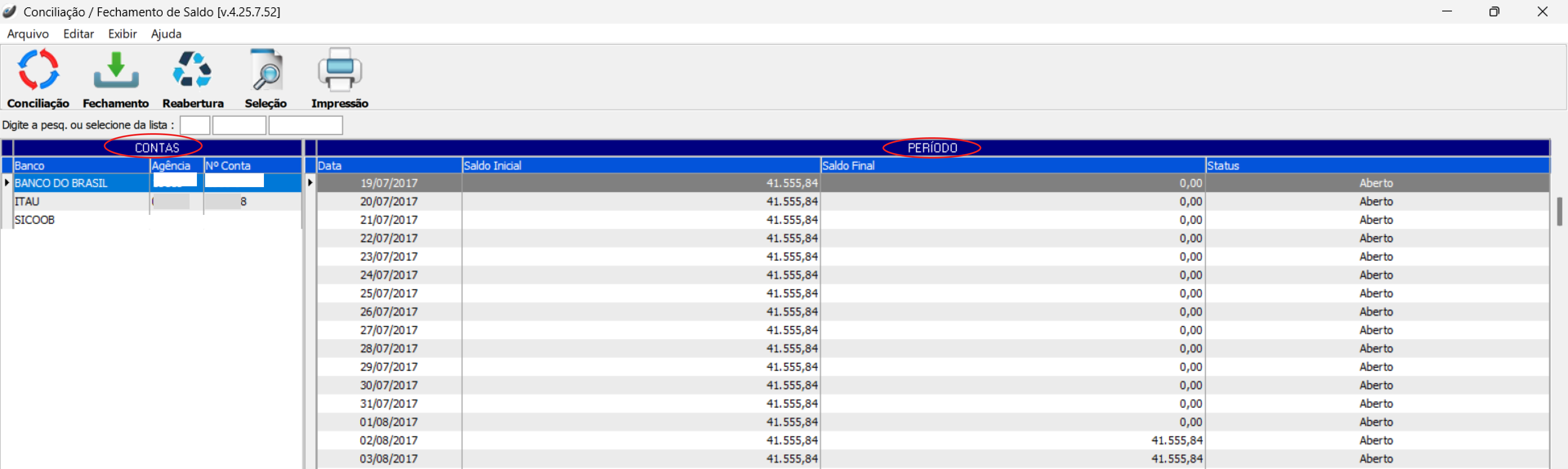 Ao abrir o módulo de Conciliação/Fechamento de saldo é possível identificar duas colunas. A primeira coluna, se refere as contas bancárias cadastradas no sistema E a segunda coluna, se refere ao período.