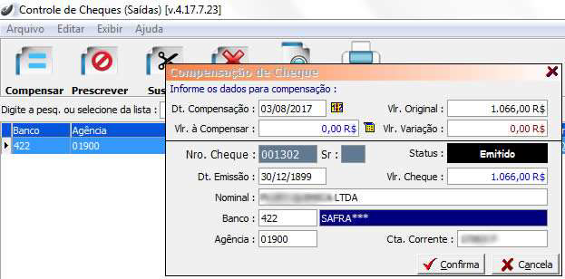 Escolha o cheque a ser compensado e clique em “Compensar”. Confira os dados e clique no botão “Confirma”.