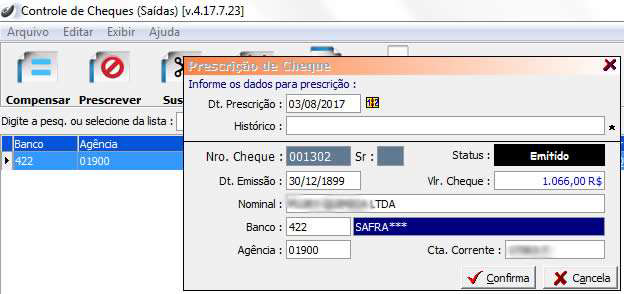 Escolha o cheque a prescrever e clique em “Prescrever”. Confira os dados, preencha o campo obrigatório (*), e clique no botão “Confirma”.
