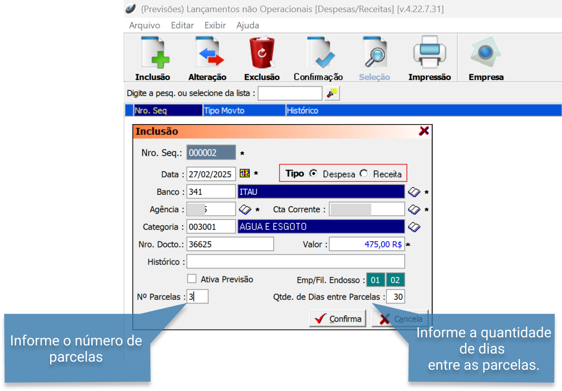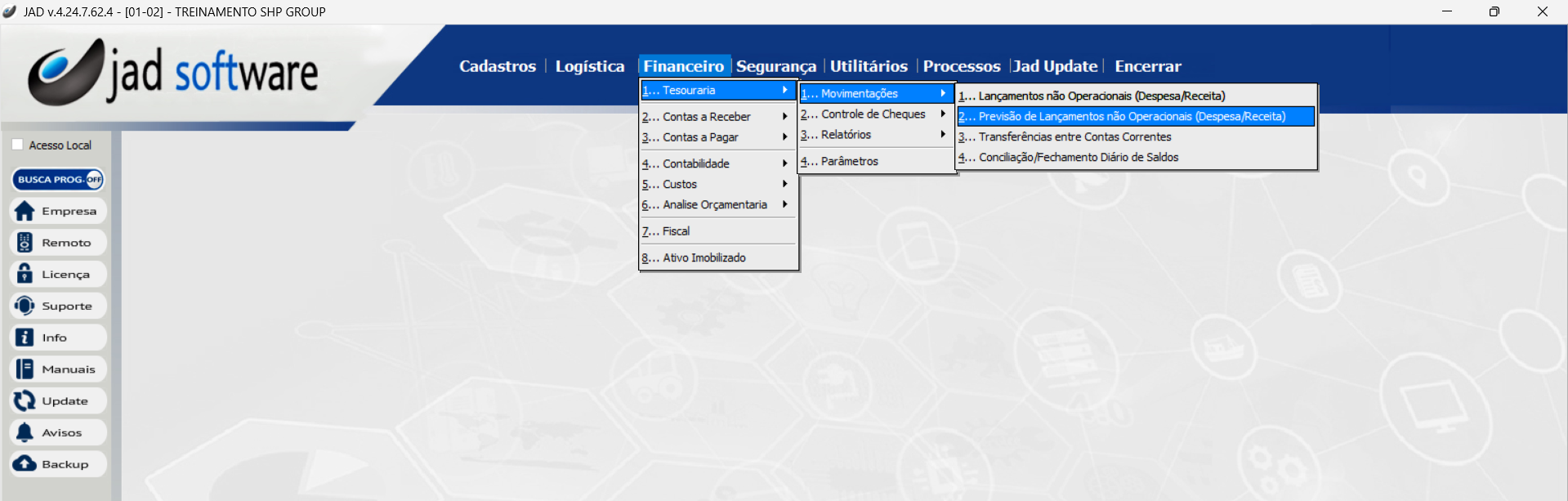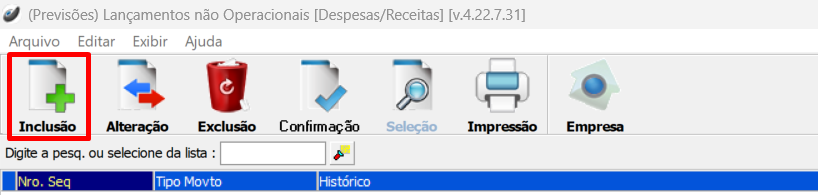 Financeiro > Tesouraria > Movimentações > Previsão de Lançamentos não Operacionais