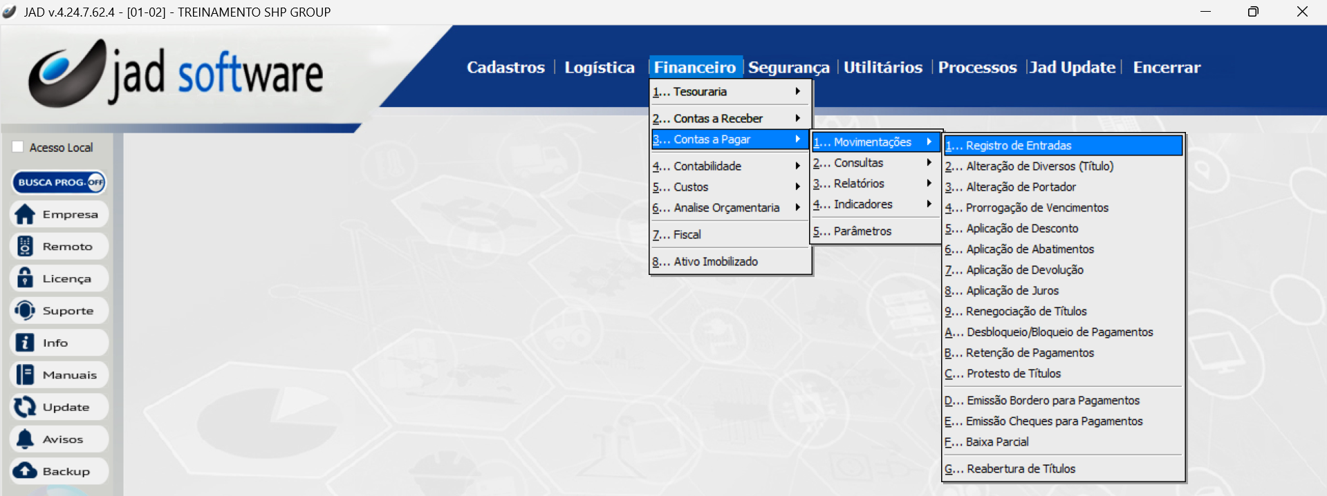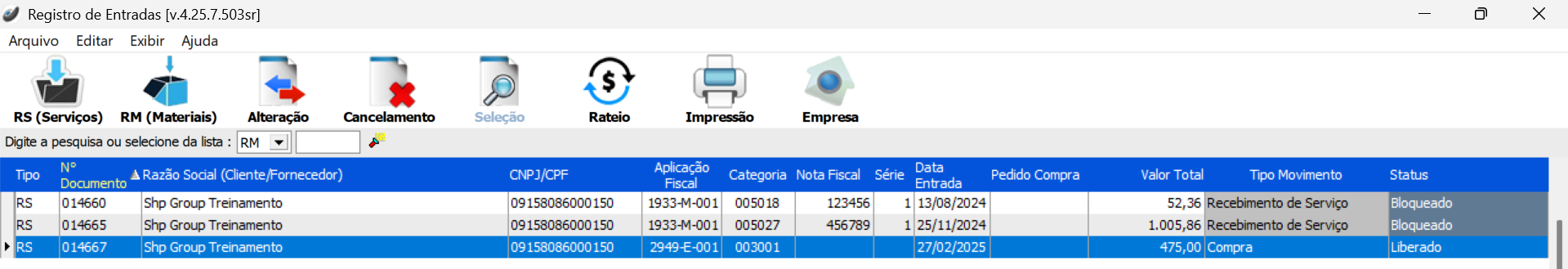 Para verificar se a geração da RS foi concluída com êxito, abra o registro de entradas através do caminho indicado na imagem abaixo: