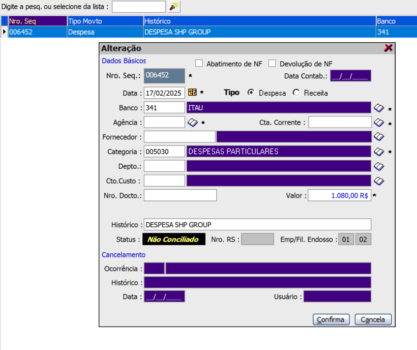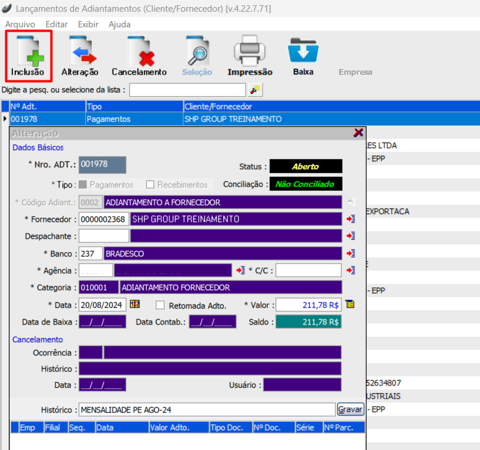 Para "Alteração" o sistema permitirá qualquer modificação nas informações nele imputada desde que o Lançamento não esteja com o Status Conciliado ou se houver Movimentação do Adiantamento, caso houver a conciliação o sistema irá permitir apenas dados do Fornecedor/Cliente e Despachante