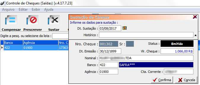Escolha o cheque a ser sustado e clique em “Sustar”. Confira os dados, preencha o campo obrigatório (*), e clique no botão “Confirma”.