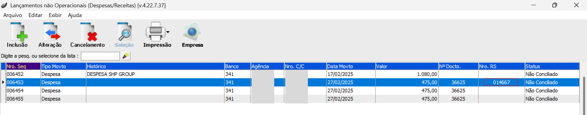 A partir do lançamento Não Operacional é possível gerar a RS.
