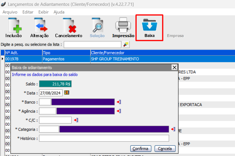 Digamos que você possua um saldo em haver ou a devolver para seu fornecedor ou cliente, neste caso utilizamos o botão de ação "Baixa" que serve de retorno dando saída ou entrada de valor ao Caixa ou Banco.