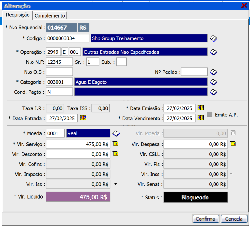 Preencha todos os campos obrigatórios (*), e clique no botão “Confirma” para finalizar a operação.
