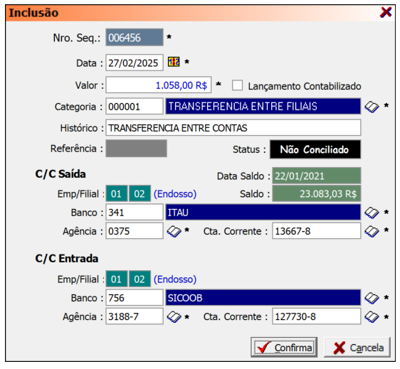 Insira as informações para a transferência (Data, Valor, Categoria, Histórico, Conta Corrente de Saída, Conta Corrente de Entrada), e clique no botão “Confirma”.