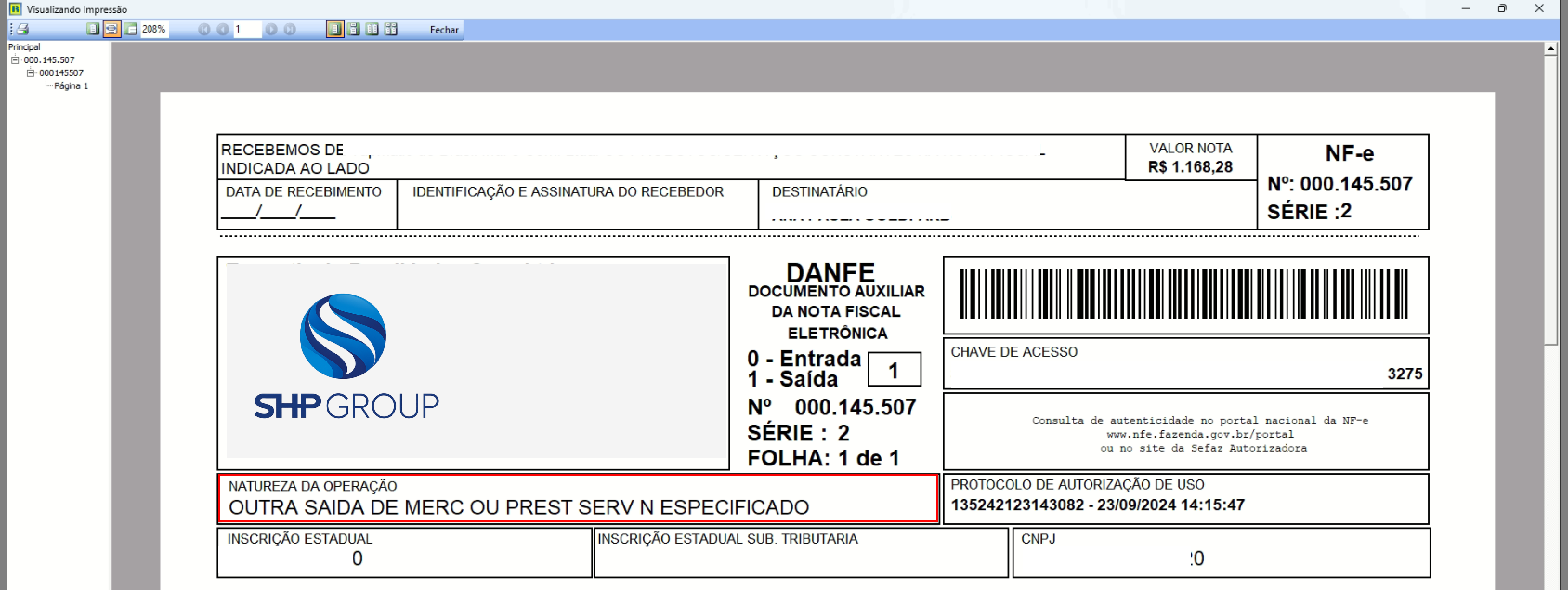 A natureza da operação pode ser visualizada na parte superior da DANFE, como no exemplo abaixo: