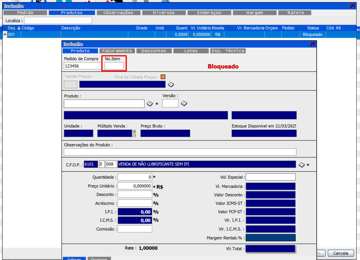 sendo preciso apenas preencher o campo “No.Item” sem zero a esquerda,