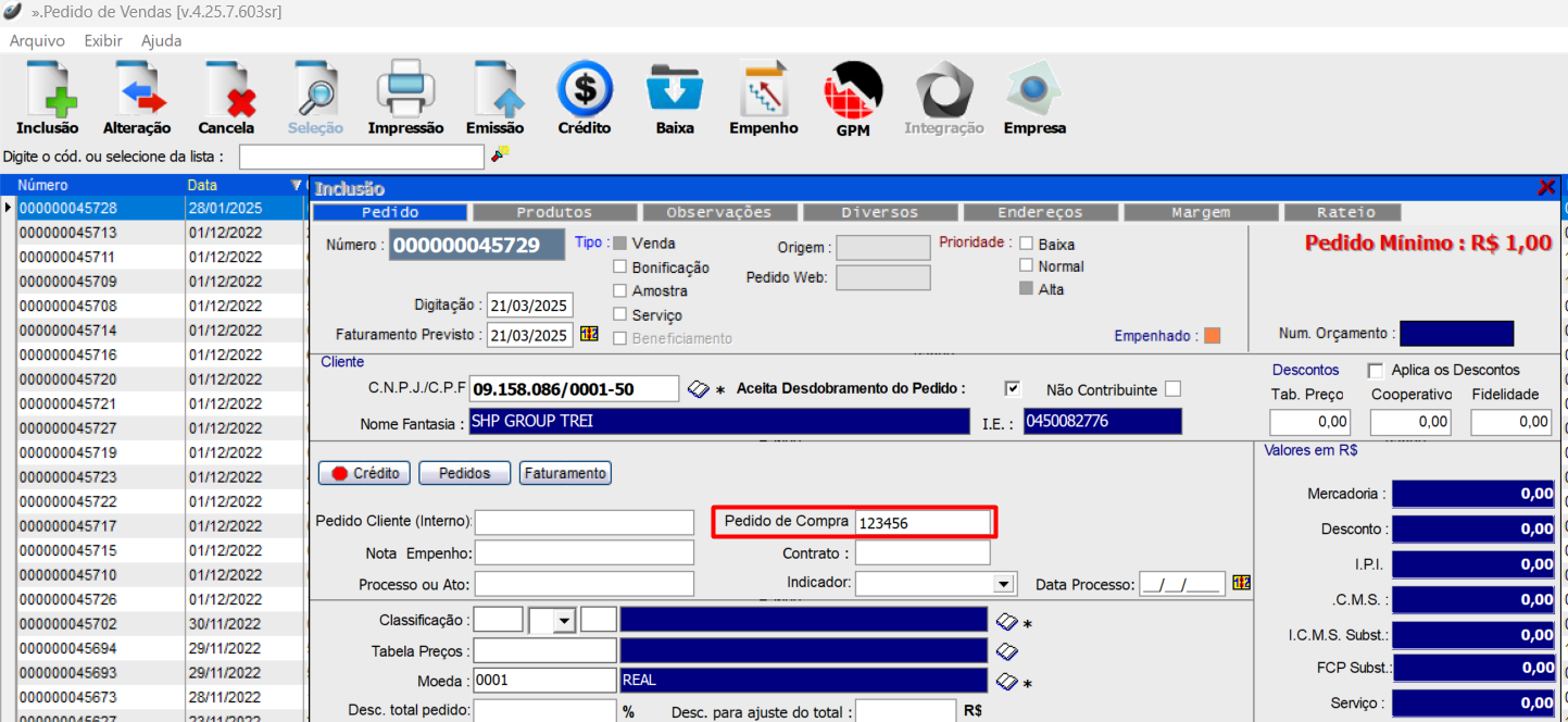 e na inclusão do produto, o Pedido de compra já aparecerá preenchida