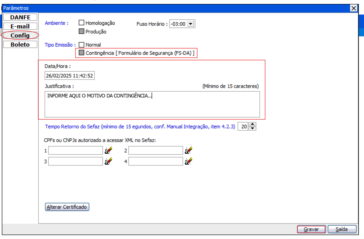 Contingência, para o tipo de Emissão e após informe a Justificativa, ou seja, o motivo da emissão das notas em Contingência, Ao finalizar, clique no botão "