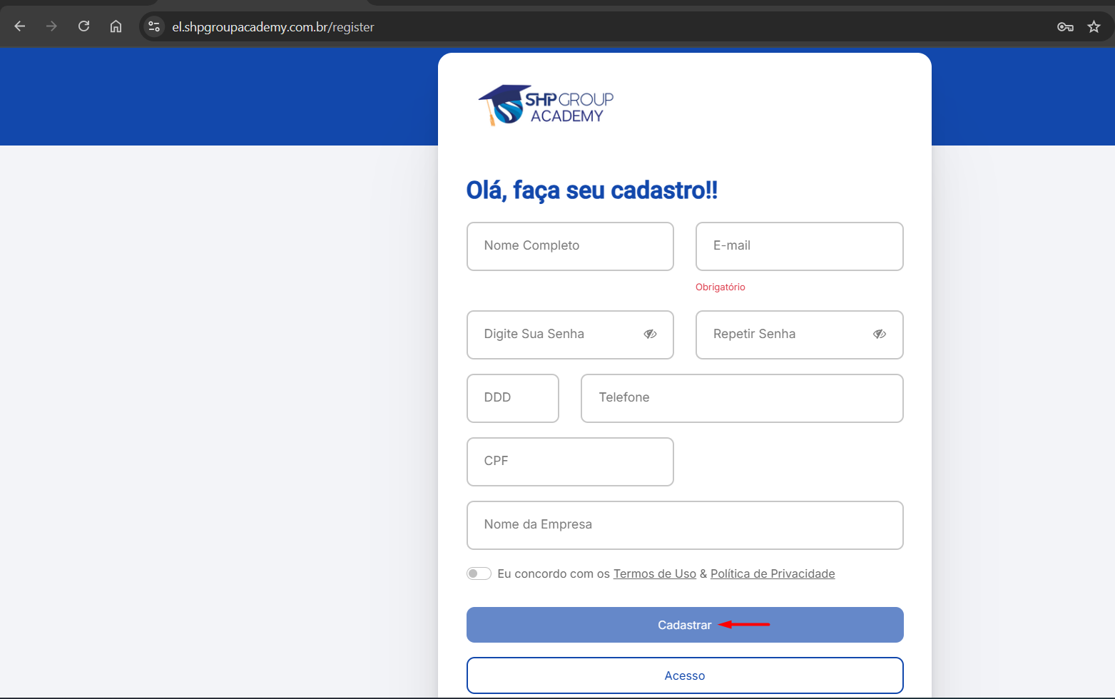 Para criar um novo acesso a nossa plataforma, ao acessar o