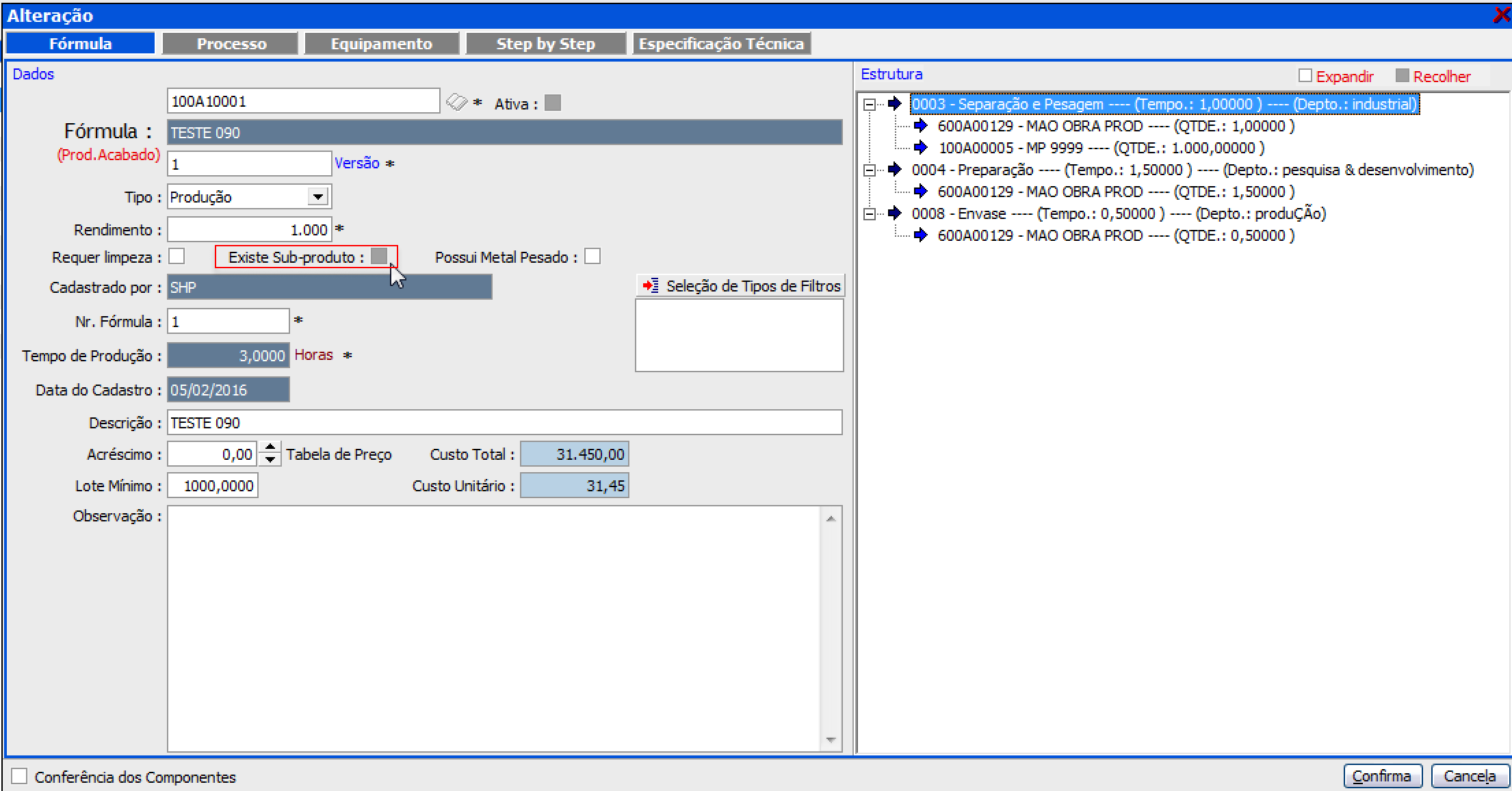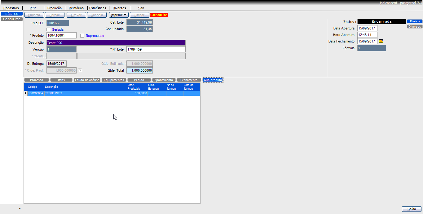 No cadastro do MRP/Formulas fora criado um ícone “Existe Subproduto”, este comando habilitará no momento do encerramento da OF uma aba denominada “ para indicar o produto e a quantidade resultante do processo que originou